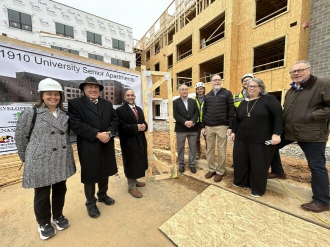 by Becky StaffieriSILVER SPRING, MD – Mission First hosted the Topping Off Ceremony for 1910 University Senior Apartments, a 90-unit affordable housing community for seniors near downtown Wheaton, MD on the former underutilized parking lot of the Har Tzeon – Agudath Achim synagogue. Montgomery County Executive Marc Elrich was joined by community members and project partners, including Ethan Goldrich and Rabbi Steven Suson from Har Tzeon – Agudath Achim.